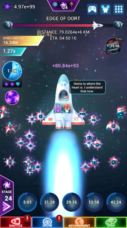 本作は宇宙飛行士の少女ステラをサポートしつつ、彼女を銀河の果てまで導くゲームです。ベースメカニックはかの有名なクッキーババアことクッキークリッカーと同じであり、クリックによって宇宙船の速度を上げつつ資源採取用のドローンを製造&レベルアップさせ、宇宙の旅を続けていきます。