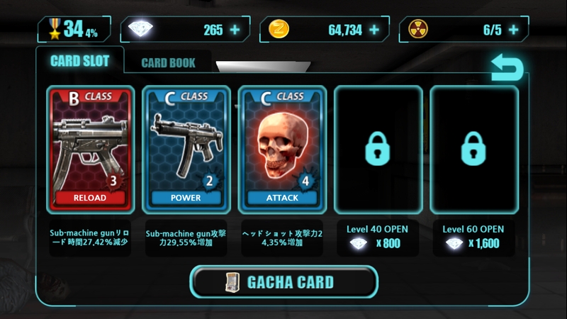 強力なカードを入手するためプレミアムガチャを回したくなる衝動をグッとこらえ、地道にダイヤを集めてカードデッキ拡張に費やすのが堅実であると言えよう。それに、カード30枚所持で解禁される武器MP5はカードデッキを拡張しなければ解禁条件を満たすことができない。