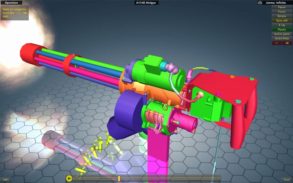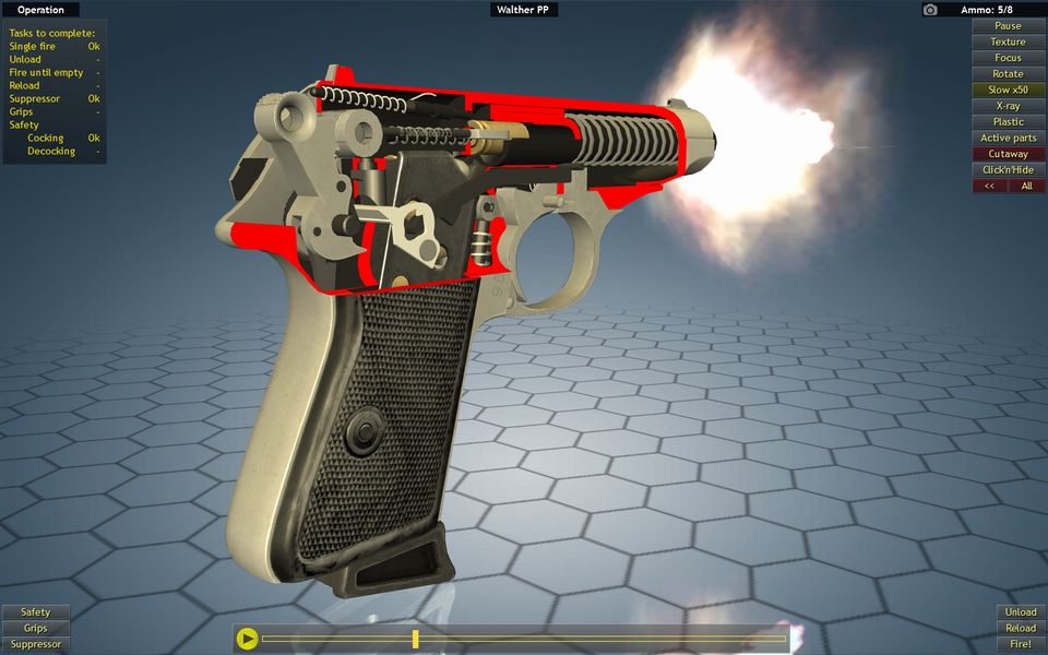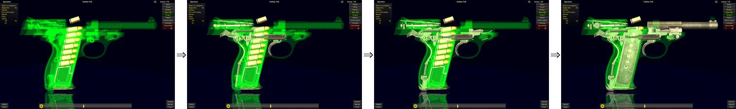 また発砲/再装填といったアクションを行なうオペレーションではX-rayモードでの透視やスローモーション(通常、2倍、10倍、50倍の四段階)を使って各部位の動きを正確に観察できるほか、各部位を色分け表示するPlastic、さらに教材用のカッタウェイ・モデルの再現まであり、しかもそのまま発砲できるという素晴らしい仕様だ。