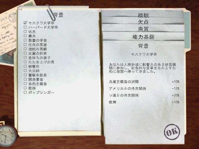 *「御曹司」…資本主義派閥の敬意上昇、観光評価と工場の生産性上昇、ゲームスタート時の国庫に2000ドル追加。ただし共産主義派閥の敬意低下。現金2000ドル追加の微妙さ加減が悪目立ちするが、それを差っ引いてもそんなに悪くはない背景。アメリカ寄り資本主義経済で行くなら無難な一択。