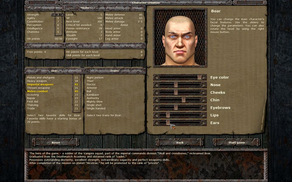 ゲームを開始したらまずはキャラメイクだ。ステータスのほかに一応顔のカスタマイズもできるのだが、これが「表情エディタか?」と思うほど変化に乏しい代物で参った。いや笑ったけど。Skillはレベルアップで軌道修正できるが、基本ステータスは初期値で固定らしいので、ステ振りは慎重に行なったほうがいいかもしれない。とはいえゲーム内容もよく知らんうちに慎重もクソもないので、今回はわりと無難な数値にしておいた。はじめはCharismaを低めにしようかとも思ったが、交渉だけではなく物品売買の値段にも関わるようなのでいちおう平均値をキープ。