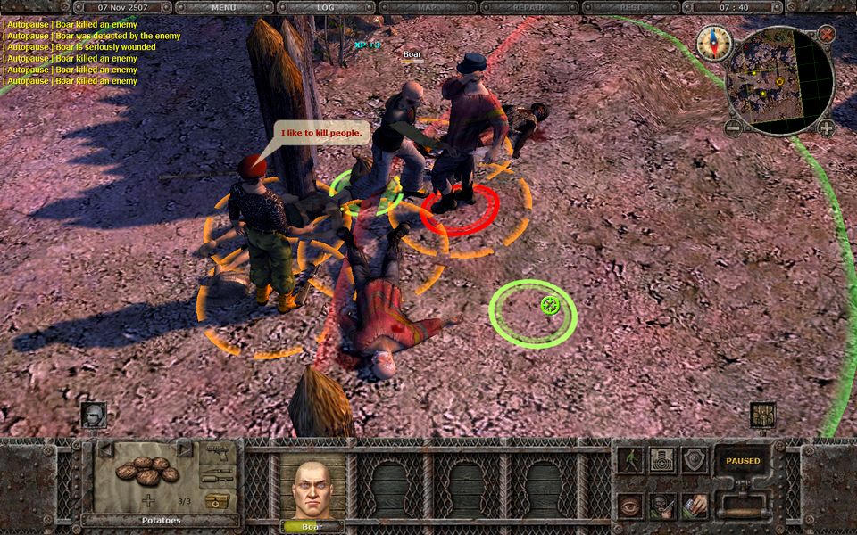 俺の中では「1C Company=Apeiron」の図式が成り立っており、またゲーム画面から受ける印象もJagged Allianceの系譜を継ぐAperion製の一連のシリーズ(Brigade E5、7.62 High Calibre、Marauder)と似通っていたため、てっきり戦闘はタクティカル・シミュレーションばりの面倒な操作を要求されるものとばかり思っていたが、実際は敵をクリックして放置するだけのMORPGの系譜であった。そもそもPlanet Alcatrazは1C Company内製なのだな。