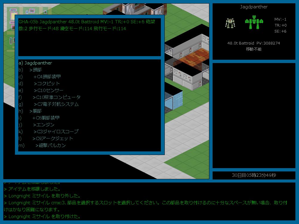 ベースはRadcliff、なぜかというと外見がもっともヤークトパンターっぽかったから。こいつは頭部コクピットなので、フルカスタマイズを念頭に入れると頭部の交換が不可能って点がなかなか微妙な欠点だったりするのですね。このカスタマイズ機ではRadcliffの原型(装備)は換装不能な頭部と胴体のフレームくらいしか残っておりません。