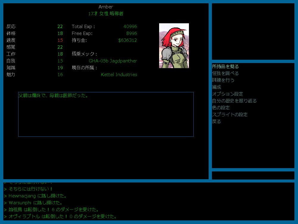 セーブデータを覗いて名前を検索したところ、装備は甲羅スーツにロケット・ガントレット、速射バズーカであることが判明。ああこれ裏の仕事もこなせる(orこなしてる)人材だわ。スキルもメック小火器14、メック操縦12とかそのへんのパイロットをやや上回る能力、こんなのがSavin乗り回したら、そら強ぇ。