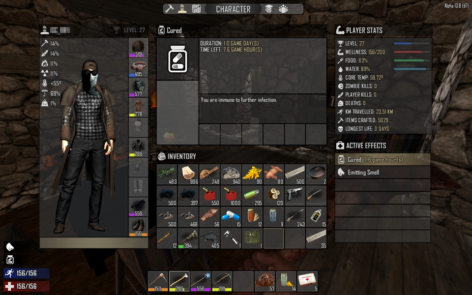 それと食糧事情が大変に厳しくなりましたね。Survivalスキルを最高まで上げてもけっこう容赦なく空腹と水分の値がガンガン減るようになりました。このへんの按配はバージョンによってけっこう変化が激しいので、今度も調整入るとは思いますけども。