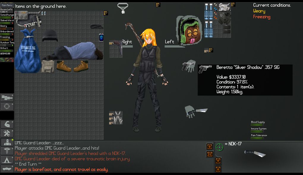 いまのところ装備アイテムが三分の一くらい、治療ウィンドウは作りかけだったやつを破棄して最初から作り直…そうと思っているところ。追加アイテムは銃器一種、専用の弾薬二種、近接武器一種、それらを収納する袋一種と、とりあえずゲームに実装するところまでは漕ぎ着けてます。パラメータはかなり未調整。