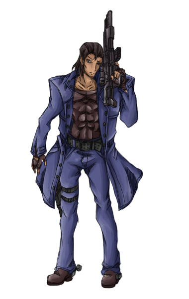 個人志向が強いのは彼の生来の性格です。また銃火器の扱いに手馴れているのは訓練の賜物ですが、利益にならない争いはしない主義なので極力戦闘は避ける傾向にあります。プロキシマでの戦いで持ち出した軍用レーザーライフルは軍の倉庫から流失した横流し品で、これは海賊時代に入手したものです(手に入れた当初は新品同様でしたが、彼は大抵の場面で威力過剰になるその銃をほとんど使わなかったため、久しぶりに船倉の奥から取り出したときにきちんと動作するか心配していました)。
