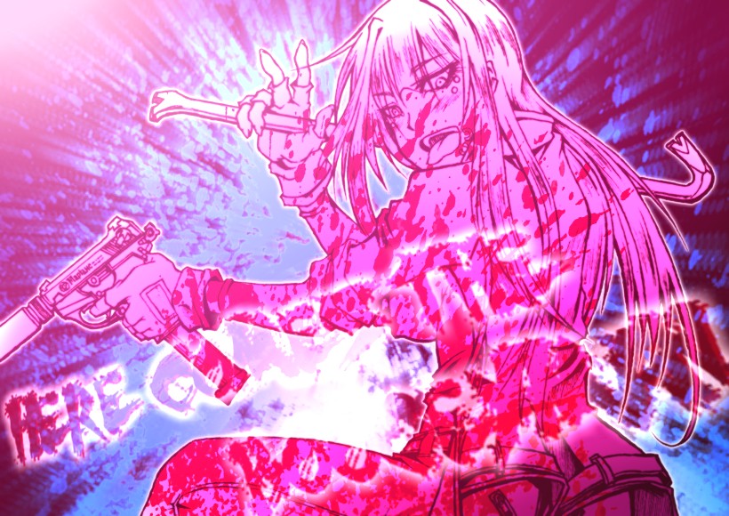 エフェクトかなりマシマシで相当見づらい&目に痛い感じですが仕様です。某マイアミや某カフカスみたいな感じで。ポーズは謎。たぶん元学友や教師に抗争の現場を見られて「イエーイ、見てるー?」してるところだと思います。元清楚なお嬢様がいまでは革ジャンにピアス大増量で虐殺を楽しんでます。たぶんヤクもやってる。