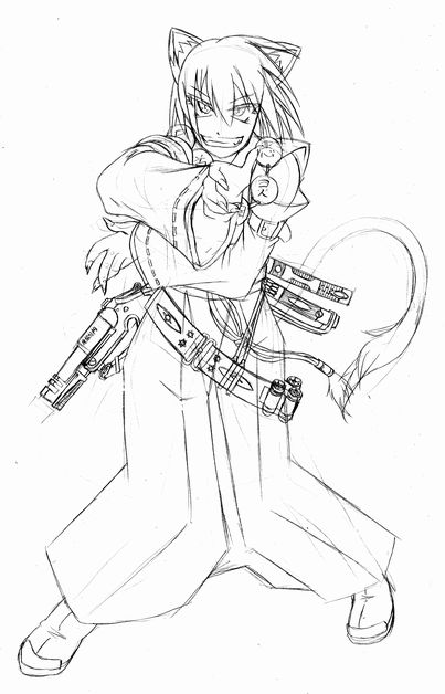 そんなわけで勇者屋に登場する敵キャラの1人「エレミーナ」の下書きです。ネコなので7つの命があります。そして敵味方問わず7回殺されます。合掌。