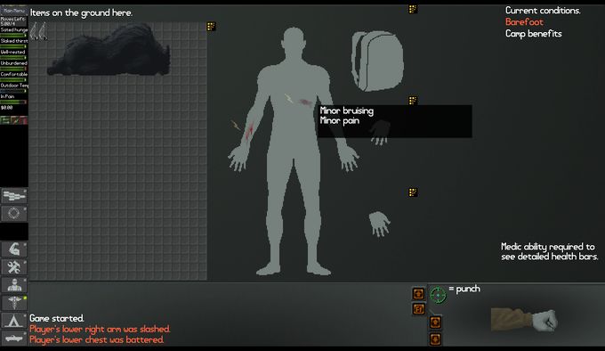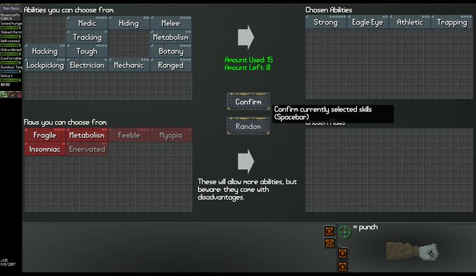 通常のプレイでは衣類、特に靴をどれだけ早く入手できるかが攻略安定の鍵になるのですが、今回の最速プレイにおいては最初のMultitool入手以外でScavengeをする必要はありません。また飲食や睡眠の必要もないため、MetabolismやBotanyといったサバイバルを有利にするスキルは不要になります。