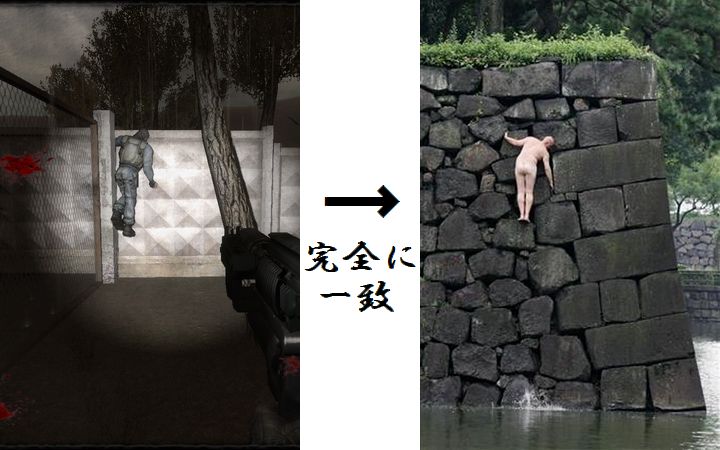 グレネードを喰らって壁に引っかかった挙句「はやにえ」みたいになっているMercenary。というか、皇居のお堀に飛びこんだイギリス人を真っ先に思い出した。