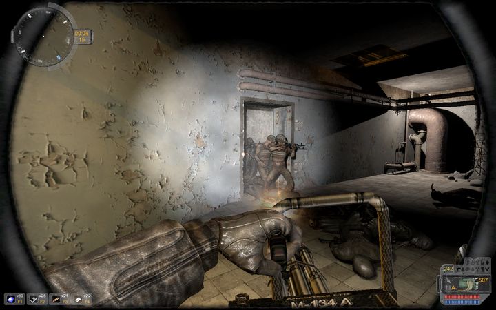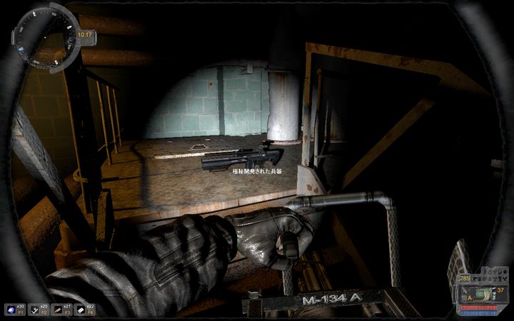 と、ここで新武器の登場だ。Night StalkersのTraderに注文することで購入できる武器、その名もM134D Minigun!使用弾薬はM60と共用の7.62mmNATO弾、命中精度と連射性能(800/min)は思ったほど高くないが、ほぼ無反動で弾幕を張れるのが強みである。弾薬の性能の高さも手伝って、X-18のような閉鎖空間では無類の強さを発揮できるだろう。テクスチャにM134Aと書かれているのは気にしちゃいけない。装弾数300発、磨耗率も低い。値段も約55000Ruと良心的で、CS強化外骨格のアホみたいな値段設定(300000Ru)を見た後だと子供の小遣い程度に思える。本体重量50kg余をどうクリアするかが課題だ。