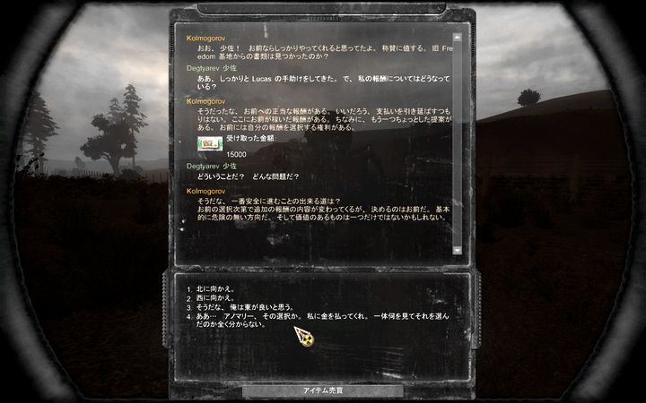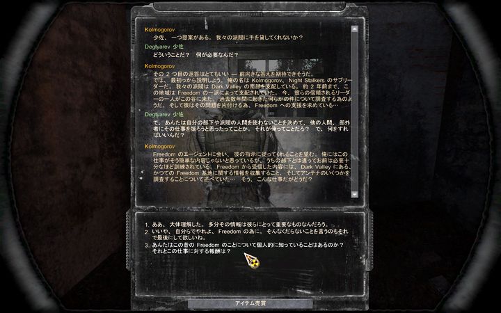 ミュータントを排除し、Freedomのエージェントに接触。「おまえ俺が戦ってる間なにやってたんだよ!」とエージェントをなじるDegtyarev。ここでの選択肢によっては追加報酬をせびることができる。