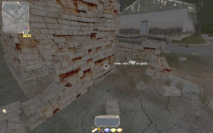 協力者の名はSnitch、Banditのロングコートを着ている男だ。彼曰くBarへの道のりは知ってるが、タダでは教えてやれないとのこと。彼が要求してきたのは、Freedom基地に隠されている機密文書。それは基地の北西にある崩れかけた壁の陰に無造作に落ちているので、拾ってSnitchのもとへ持っていこう。