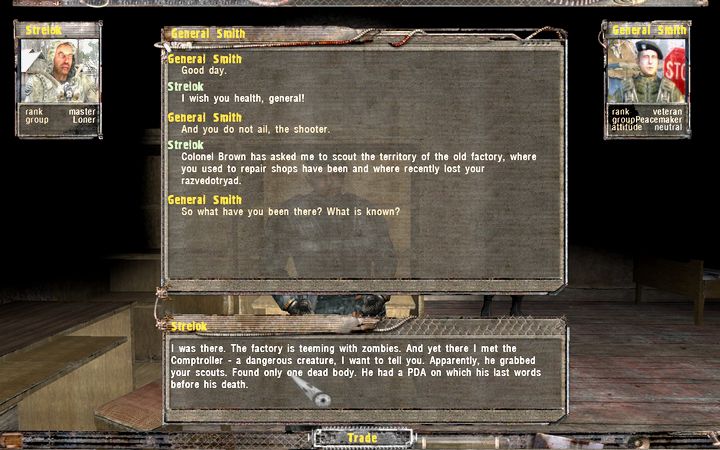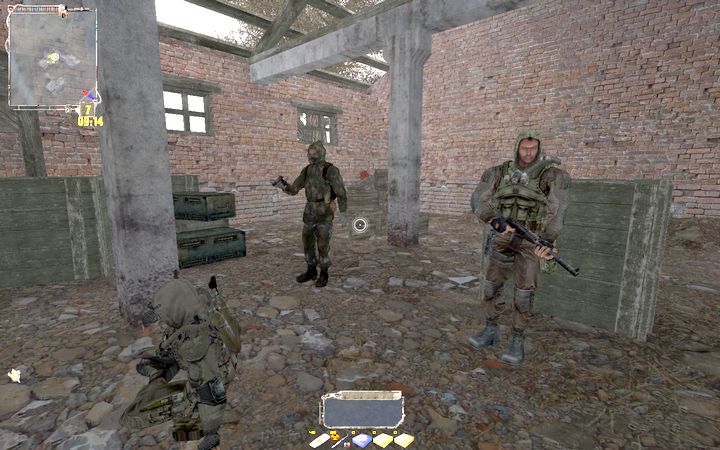 Barkeepに話すと、今度は南の軍検問所にいるYarofeeva少佐に話を聞きに行けというタスクが追加される。軍検問所に近づくと、付近で待機していたStalkerのグループが襲撃を仕掛けるので、それを利用して内部に侵入しよう。