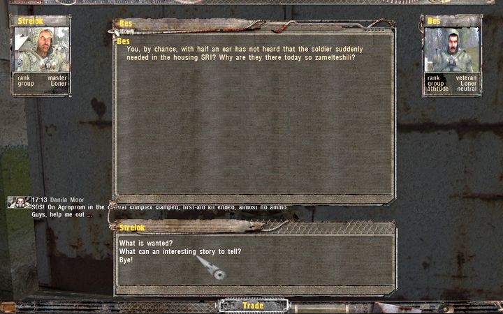 早速Agropromへと向かおう。Stalker基地にいるBes(また貴様か)に話しかけるとStalkerたちが一斉に行動をはじめ、研究所(軍敷地内)の掃討に乗り出す。目的は虜囚となったLeftyの保護だ。これは、もともとLeftyを探していたStrelokの目的とも一致する。