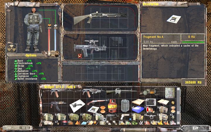 ちなみにSnitchはタスクとは別にPDAを要求してくるので、手持ちに余裕があれば利用するのも手だ。PDA10個で弾薬との交換、20個でStashの情報をPDAに記載してくれる。ただしPDAは1個0.3kgもの重量があるので、これを目的に集めるのはいささか非効率的という気もする。