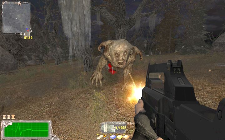 このあたりでTraderのPetrenkoが出現するので、彼とも話しておこう。彼からはマップ中央にかかっている橋の西側の沼地に生息するミュータントの殲滅を依頼される。ここには緑色のSnorkがおり、かなりの強敵だ。Snorkを全滅させPetrenkoに報告すると、Protectaという強力なショットガンが手に入る。装弾数12発という大容量が魅力的だが、他のショットガンと違いプライマリにセットされる。
