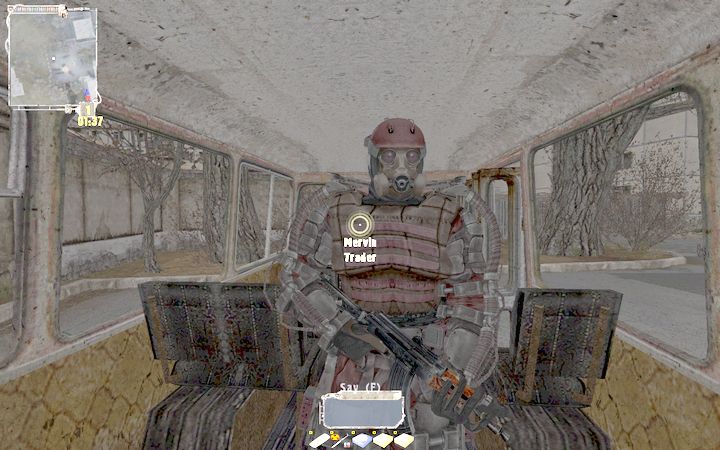なんとこの時点で装備がすべて消失している!Mervinなる男(所属はTrader)に話しかけると、ピストル1挺渡されて「付近にいるSnorkを退治してこい」などと言われます。このTaskを受けた時点で所持金もゼロに。悲しい。