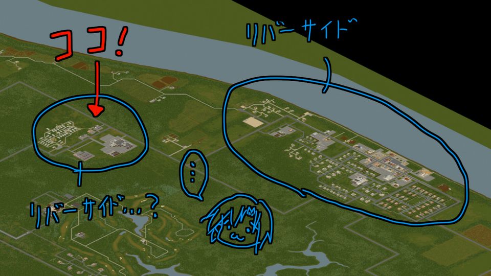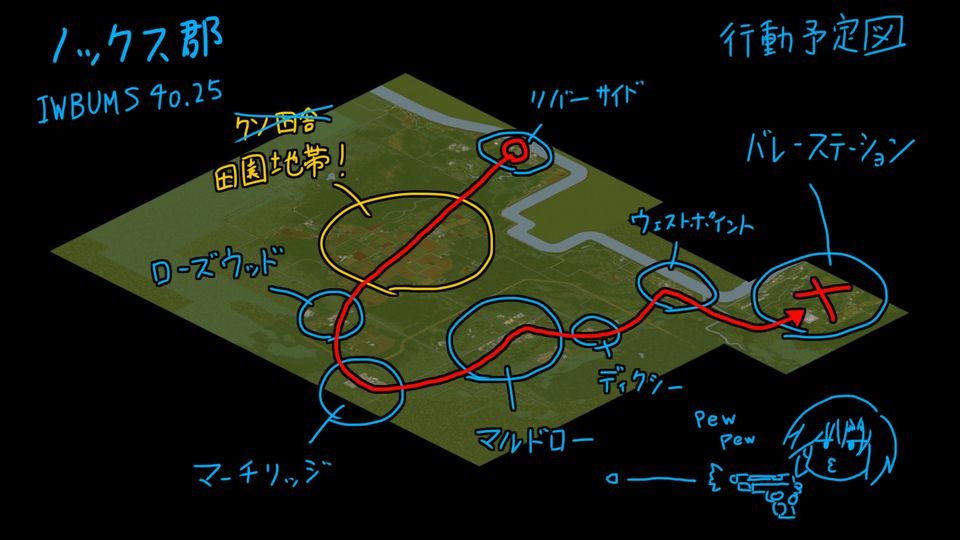 さて今回のゲームプレイ・コンセプトについてですが、パッチの更新を重ねてマップもだいぶ広く、且つ作り込まれてきたということで、舞台となるノックス郡全域を一周して回ろうかと考えています。リバーサイドを起点に反時計回りにぐるりと回って最終的にバレーステーションを目指す形になります。