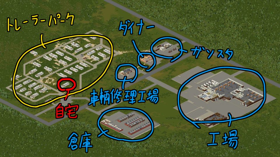 初日にトレーラーパークの探索を終え、二日目は東にある倉庫の探索に行きます。