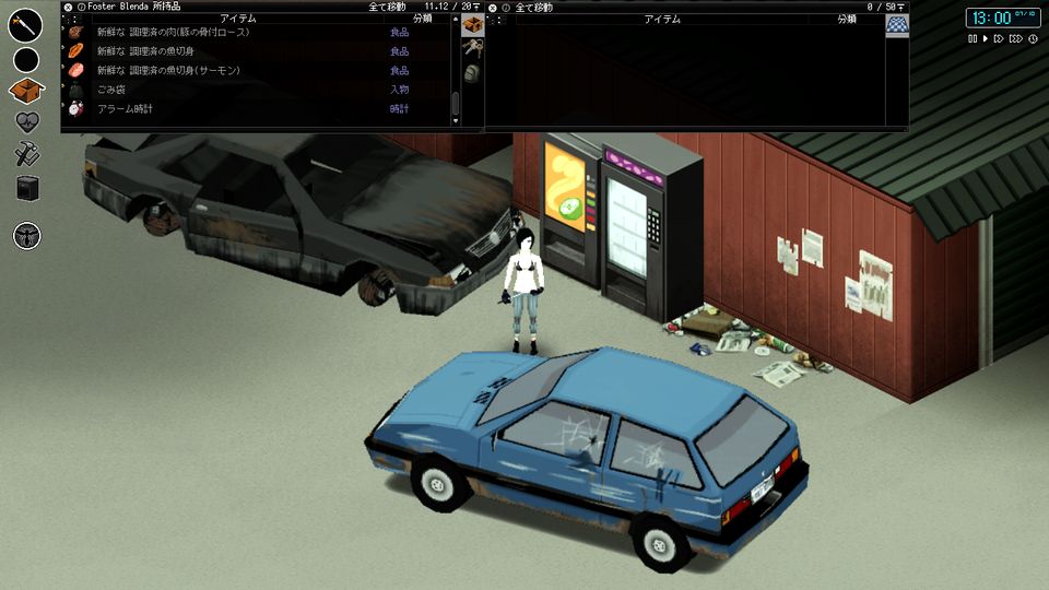 また、倉庫の自販機の前に今回初となる車輌を発見。どう見ても事故車ですが。いちおう設定で施錠をオフにしてあるので乗車自体は可能なのですが、簡易設定まではオンにしていないので、キーが発見できず運転できません。