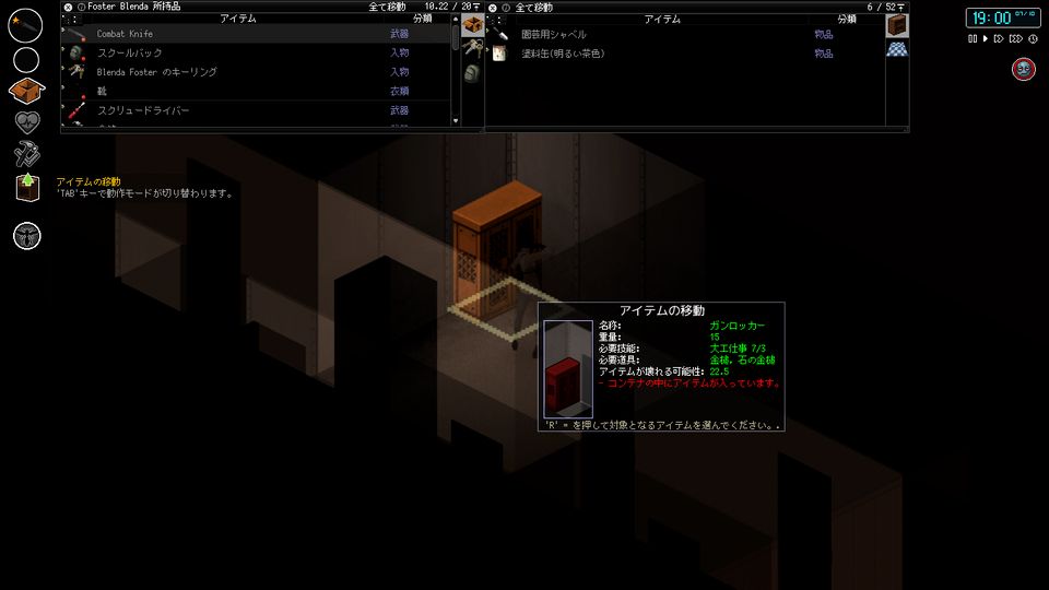 プレイしてみて驚くのが、出現するアイテム量の少なさです。いや自分でそういうふうに設定したんですが、想像以上でした。まず、ほとんどのストレージに何も入ってない。銃をメインに使うならほぼ必須ともいえる幸運の特性を今回もつけてあるんですが、それでもほとんどアイテムが手に入りません。包丁どころかバターナイフすら貴重品になるとは思ってもみなかった。
