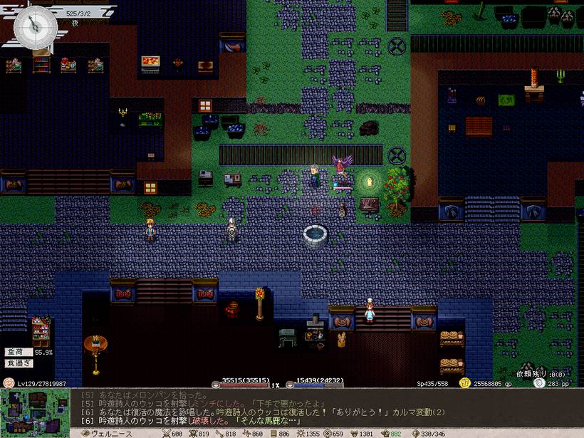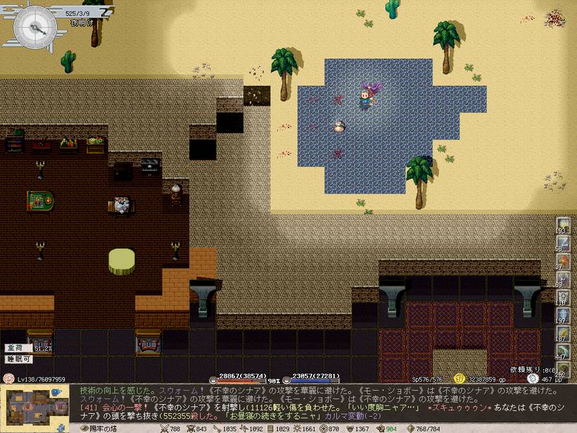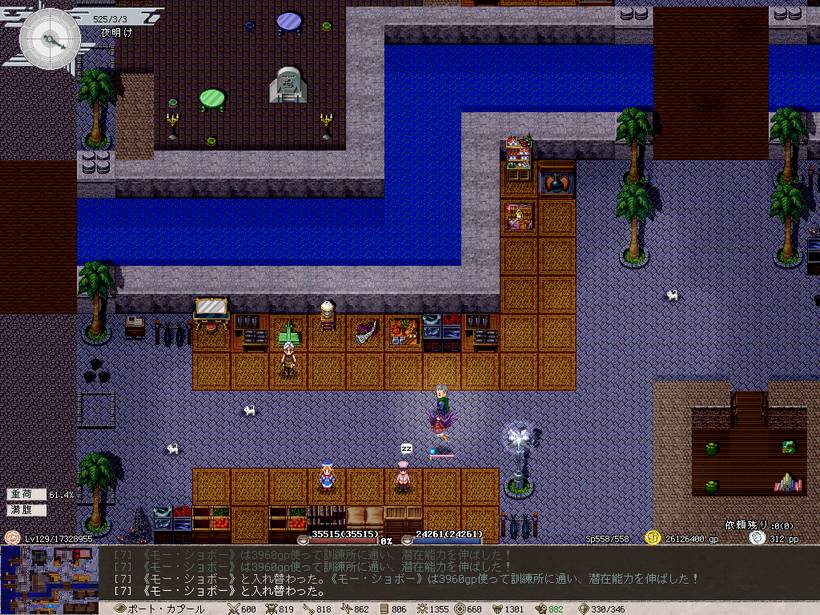 ここでは戦士ギルドのノルマ報告、アリーナ&ペットアリーナ、食料品店やブラックマーケットなど見るべき部分が多く、特に雨が降っている場合は着衣水泳スキルの鍛錬も兼ねて釣りをしていることが多いです。