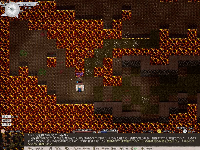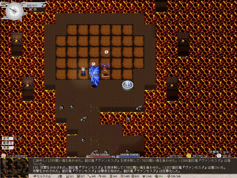 少々進路を軌道修正し、セルタ火山へ突入。ここでは朱雀や黄炎竜、ラーヴァゴーレムなどの強敵が多数待ち構えています。ひたすらの一本道風ダンジョンなので、テレポートでも使わない限りは雑魚を回避するのは難しいでしょう。まあ、そんな小細工をする気は最初からないが。