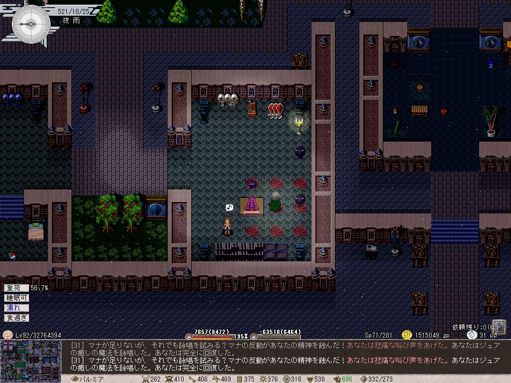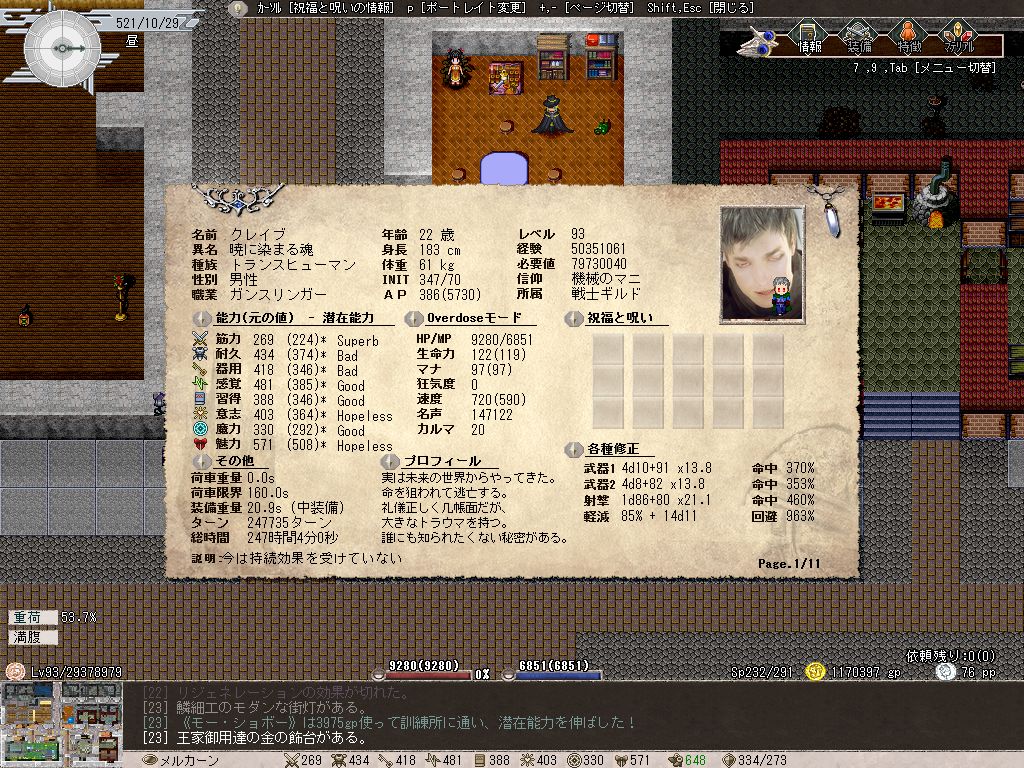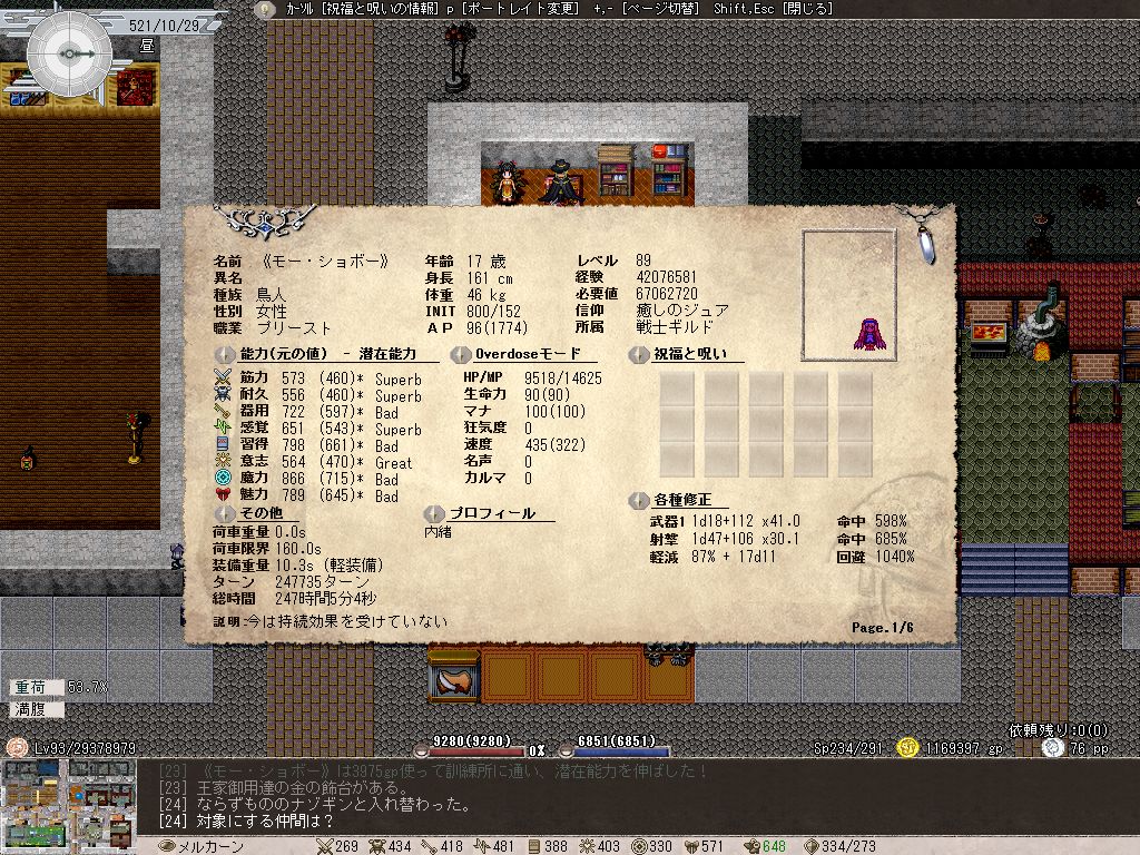 Elona Plus、ようやくPCのレベルが100に到達したぞー!ということで、今回はPCとペットのステータス&装備、現時点での各種統計データを公開します。