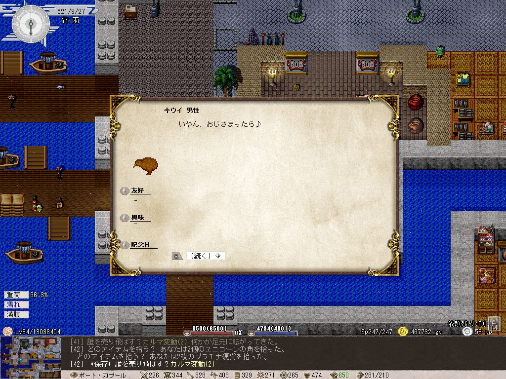 もともとAPはユニーク化に使うつもりでしたが、速度を上げないとやや苦労する場面が目立ったのでとりあえず幾らか速度に振っています。旅歩きで上がるまで待てない。速度上昇系のアイテムはPCに使いたいしね。合計値がやたらに高いのはエーテル装備で固めているのと、おそらく着衣水泳が上がっているせい。