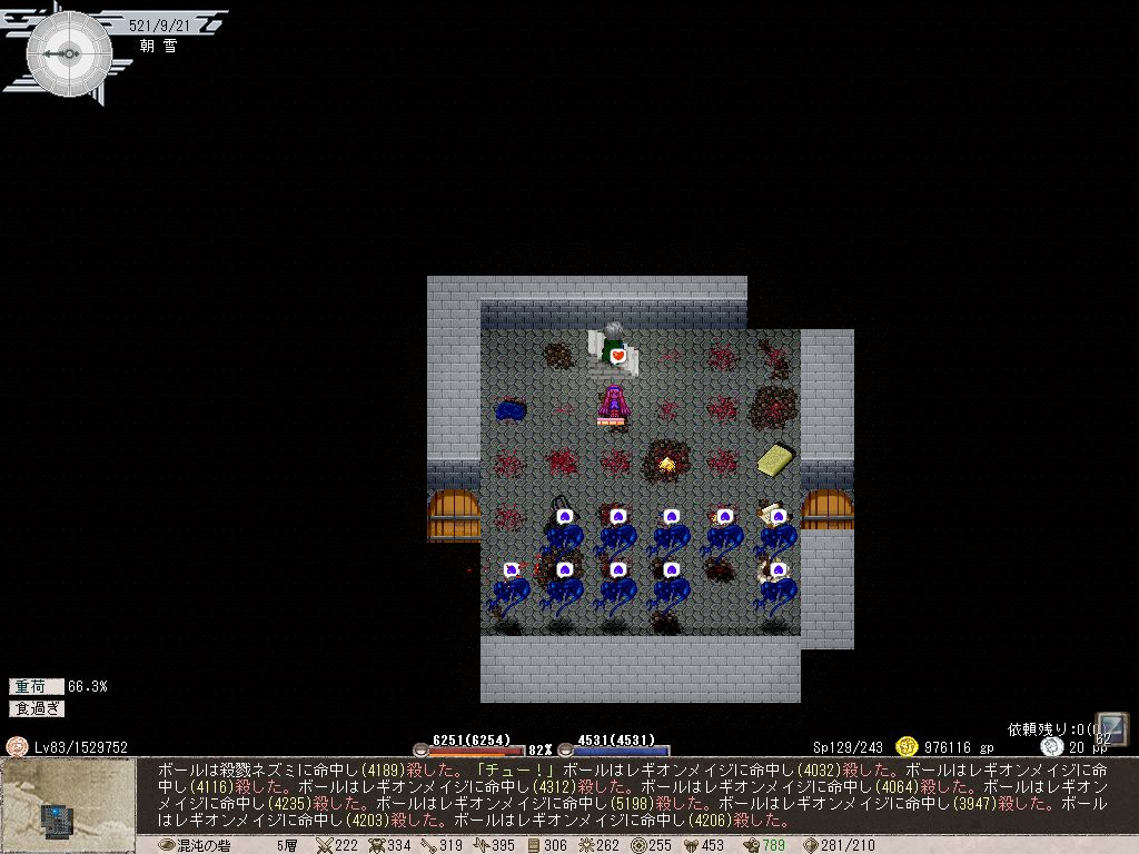 筋力:近接戦闘をほとんどしないため重量挙げに頼るしかないが、重荷状態でも速度がガクッと下がるのがイヤで鍛えなかったツケがいま如実に響いている。とりあえず現在は重荷状態でも速度が600近いので、今後はなるべく重荷状態を維持する。もっとも普通に活動していればそうそう重荷状態にならない現在、窃盗を鍛えるため盗んだブナの木を常時持ち歩いているという。なんだこれ