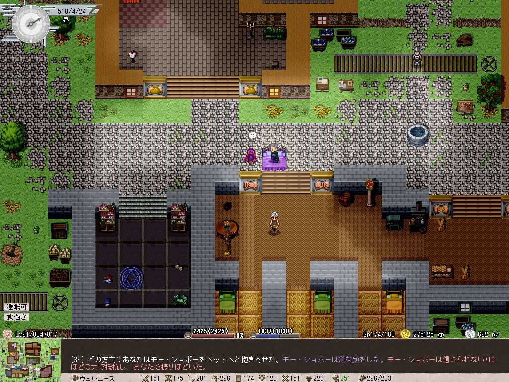 そんなわけでElona Plusですよ。バージョンは1.63。未だに開発が続いてるって本当に凄いな。効果未実装の新要素もチラホラ目についてますし(都市経営など)、先が楽しみなゲームであります。