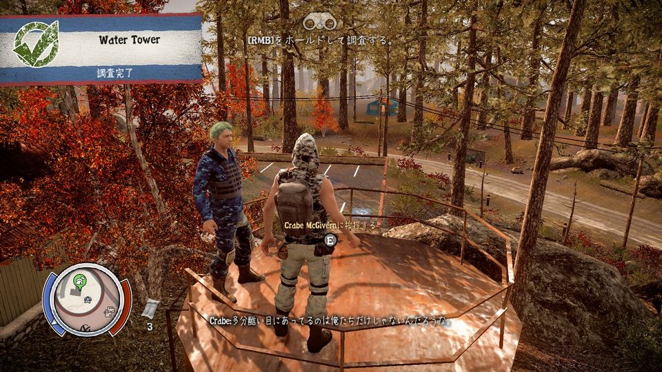 トーマス:「すまないが、このあたりに生存者が残っていないかどうか確認してきてもらえないか?裏手の給水塔から周辺の様子を観察できるはずだ」
