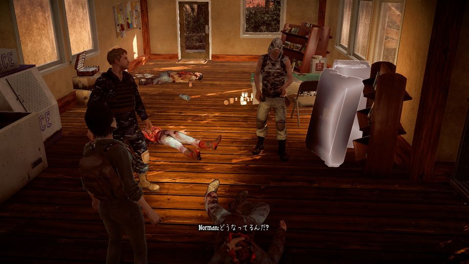 ノーマン:「君が外でゾンビを相手にアクションをしたり、重い荷物を抱えて駆けずりまわったりせず、一日中無線機に張りついているのは、それが理由か。どうして最初に言わなかった…」
