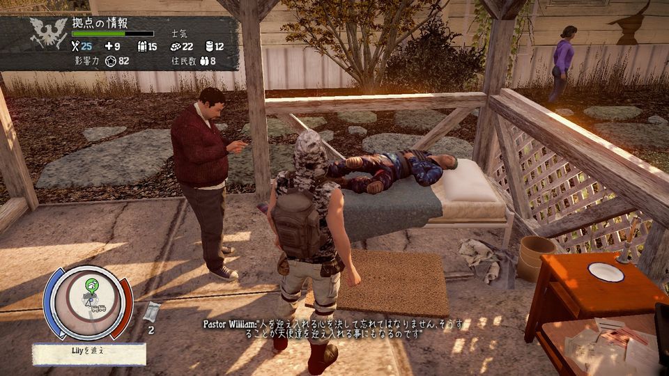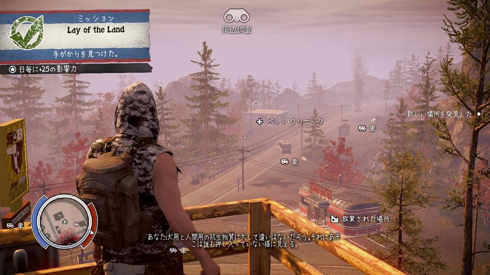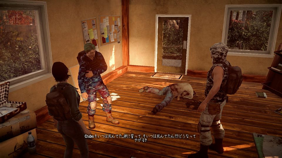 どうも、グレアムです。ATOM RPGのプレイ記の途中であり、Doom 2のMODであるTotal Chaosの攻略記事でも書こうか、などと言ってから三週間近くが経過したのちになぜか唐突にState of Decayのプレイ記など書き始めるムラっ気の多さよ。しかも2ではなく今更1のほう。まあだいたいいつも通りだ。ゲームプレイにあたっては有志の日本語化を導入しており、大変に快適な環境でのプレイが可能で非常にありがたい限りです。訳が怪しい部分(機械訳?)は原文を併記するという、あまり類をみない心遣いもグッドです。