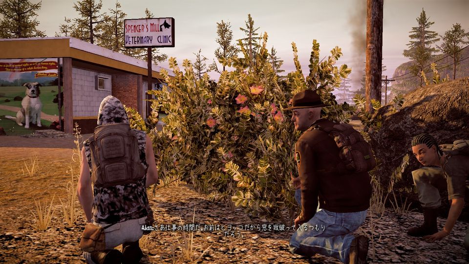 草むらに隠れつつ、三人は「スペンサーズミル動物診療所」と書かれた看板の立つ建物を観察する。サムの言によれば、ゾンビたちは主に音に反応して集まる習性があり、視力や嗅覚は衰えているため、視界の通らない場所に隠れていれば発見されることはそうないということだった。