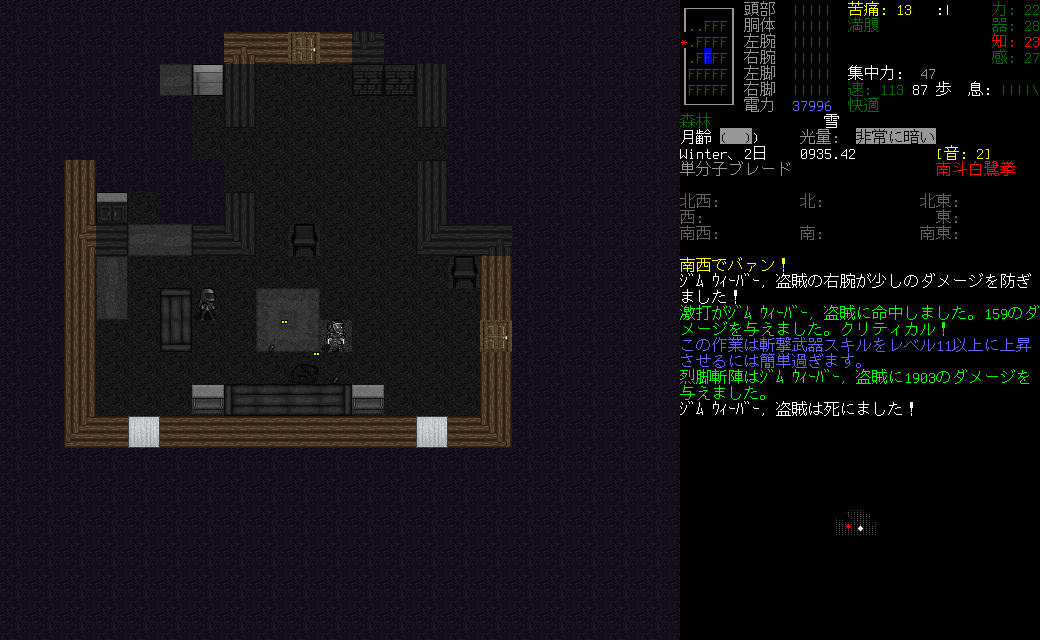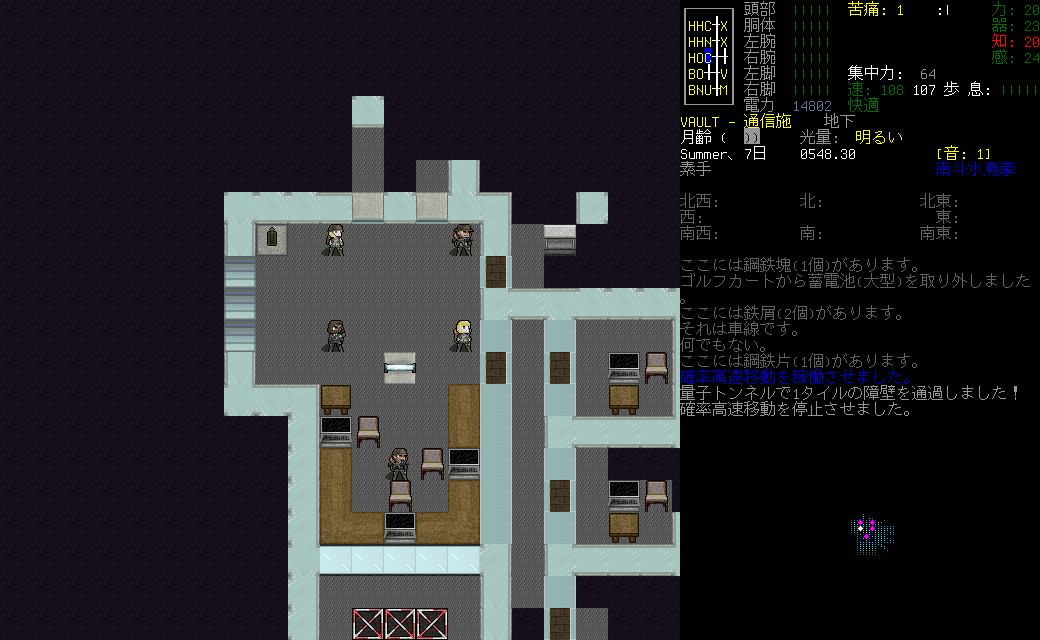 凝ったレイアウトの電気店でノートPCを確保、携帯型操作端末を製作する。よし、これでロボットは怖くなくなったぞ。それと、銀行で手に入れた重軍用アーマーを解体してケブラーを取り出し、いままでの戦いで傷ついたサバイバー装甲スカウトスーツを修理する。こいつは裁縫ではなく溶接での修理になるのだな。