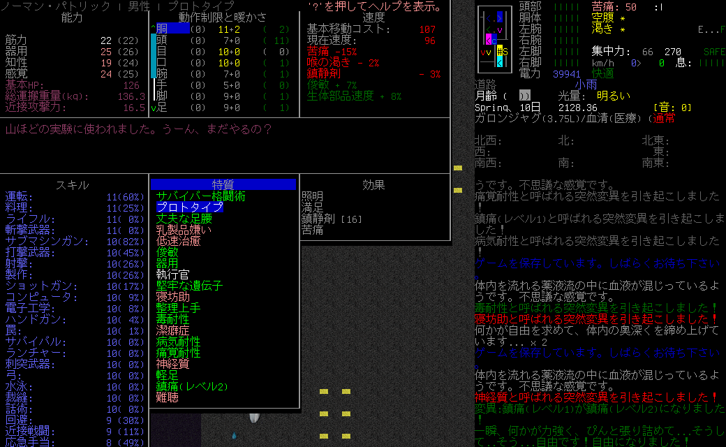 最終的に取得したのは堅牢な遺伝子、寝坊助、無痛、病気耐性、神経質、筋力発達(レベル2)、鎮痛(レベル3)、そしてプロトタイプ…という結果になった。まあ、利の方が大きい、と言えるだろう。なにより、一番最初に堅牢な遺伝子を引けたのが大きかった。