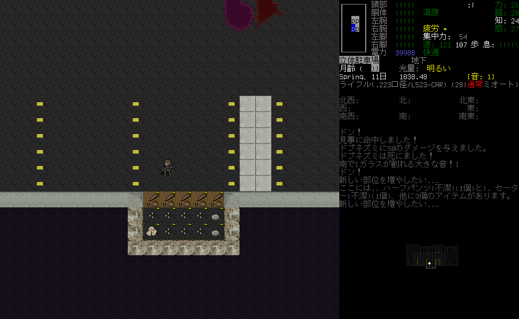 そろそろ漂白剤が貯まってきたので、大量の死体を解体しつつ変異原物質の製作にはいる。今回は街中の放置車輌からそこそこの量のM855弾薬を入手できたので、形を保っている死体が多い(素手で倒すとバラバラになるからなあ)。それと、兵士ゾンビの所持していた双方向無線機から中継回路を取り出せることが判明した。