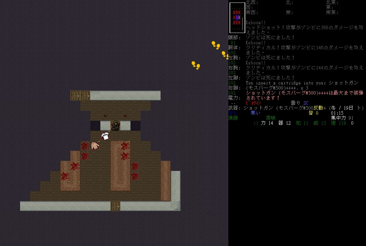 どうも、グレアムです。相変わらずのCataclysm : DDAです。今回はTileSetについてちょこっとだけ触れます。ゲーム自体は、ちょっと行動がマンネリしつつある前データを放り出して新規で始めたらいきなりFEMAキャンプが近くにあって、何も考えずに突入して火元への弾薬投下で自爆死したりとかそんなん。