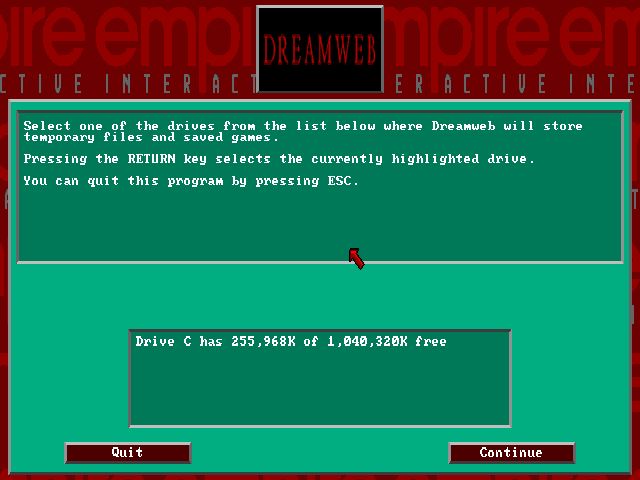 インストールが終了するとコマンドラインの表記が「C:\DREAMWEB>」となっているはずなので、ここでDreamwebとタイプ。Dreamwebフォルダ内のDreamweb.exeが起動し、ゲームがプレイできるようになる。