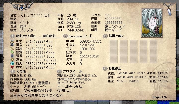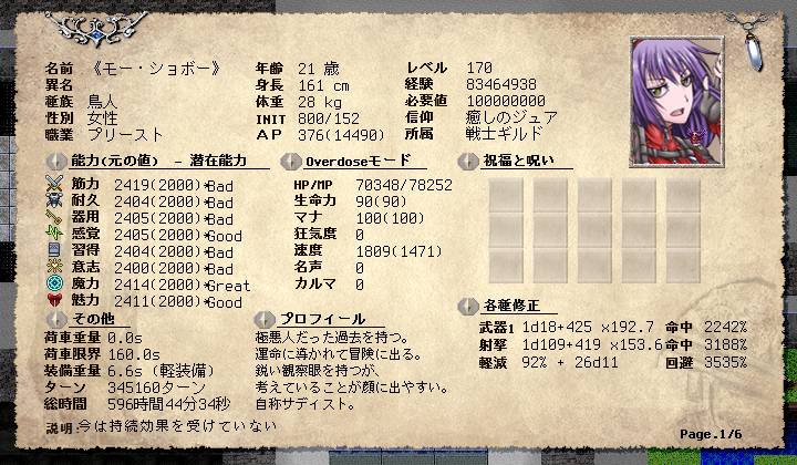 戦闘系、特に上昇させにくい回避や見切りはBPを使って集中的に上げてますね。Overdoseでは特にBPの効果が大きいので、APが貯まったら積極的にBPに交換してます。魔力限界なんか、普通にプレイしてたらまず成長しないですからね。一応、万が一のことを考えて伸ばしてあります。