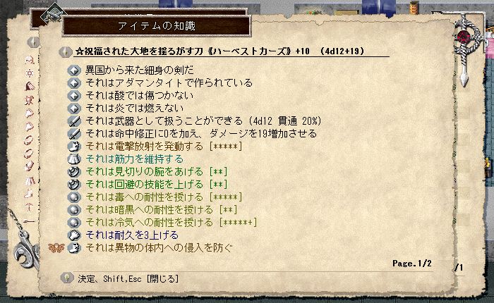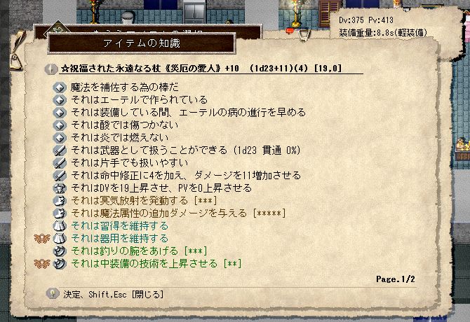 性能的にはいままで使っていた杖・罪を背負いし雪月花(名前がめちゃくちゃカッコイイので気に入っていた)とどっこいなんですが、属性パズル的にこっちのほうが都合が良かったので乗り換えです。