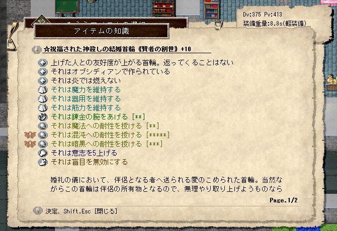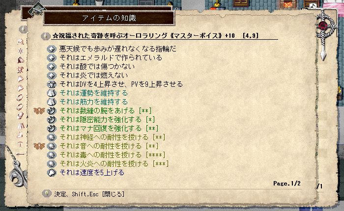 この装備がどれだけ優秀かは、Elonaプレイヤーであれば理解して頂けることでしょう…オーロラリングとセブンリーグブーツは、まともなエンチャがつかないことが多いし、そもそも神器を目にすること自体が本当に奇跡のようなものですから。有り難いことです。