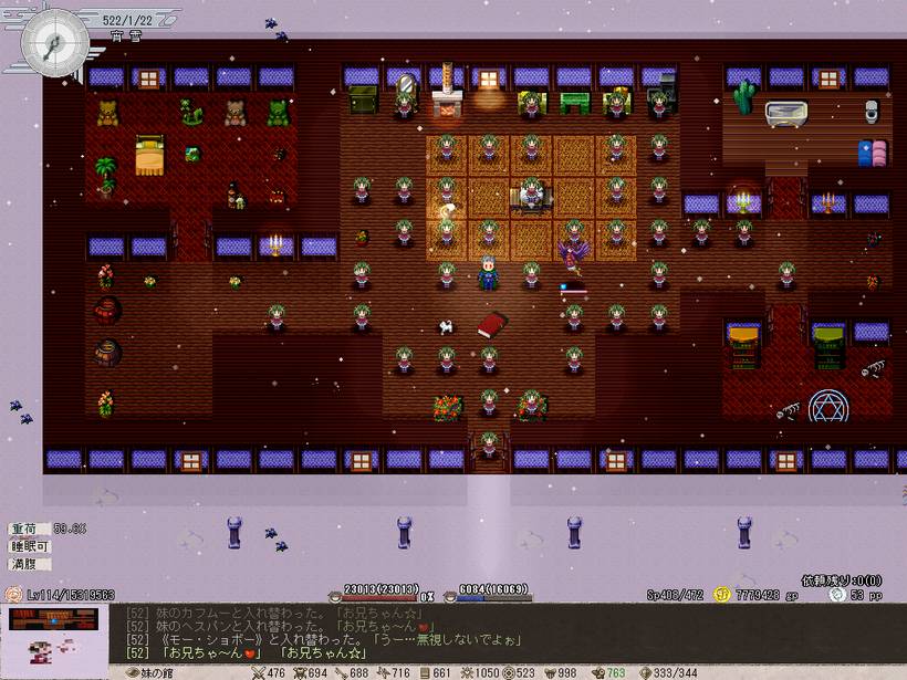何度か通常マップに入ったのち(方向音痴)、妹の館へ到着。と思ったが、あれー嬢とシルバーキャットがぼちぼちいるだけで、山のように蠢く妹の姿が見えないぞっと。とりあえず妹から弁当を買うついでに投資し、情報調査。ああそうか、妹を殴って敵対しなけりゃならんのか。