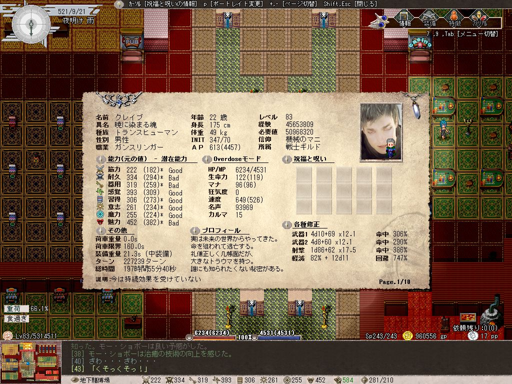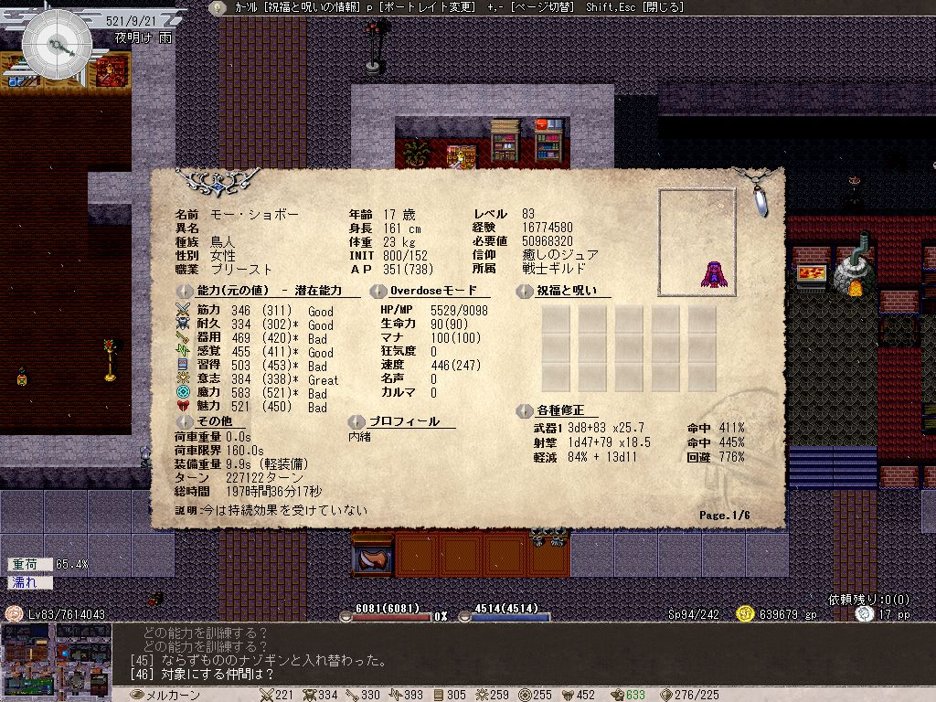 筋力:近接戦闘をほとんどしないため重量挙げに頼るしかないが、重荷状態でも速度がガクッと下がるのがイヤで鍛えなかったツケがいま如実に響いている。とりあえず現在は重荷状態でも速度が600近いので、今後はなるべく重荷状態を維持する。もっとも普通に活動していればそうそう重荷状態にならない現在、窃盗を鍛えるため盗んだブナの木を常時持ち歩いているという。なんだこれ