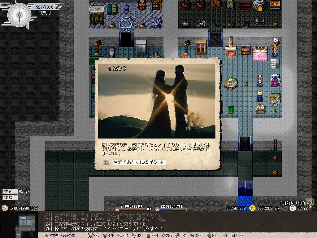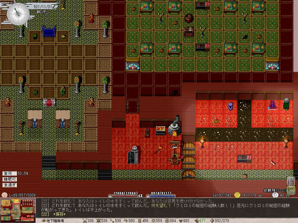あと潜在値を回復する大型ピクニックバスケットですが、あれ満腹状態でも問題なく使えるんですね。いままでPCとペットが両方とも空腹の状態でないと使えないと思ってたんですが、たまたま操作ミスして二人とも満腹のときに使っても特に嘔吐などのペナルティが発生しなかったので驚きました。たぶん、想定通りの動作ではないと思いますが…