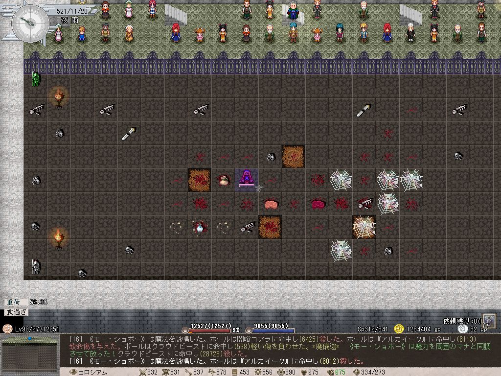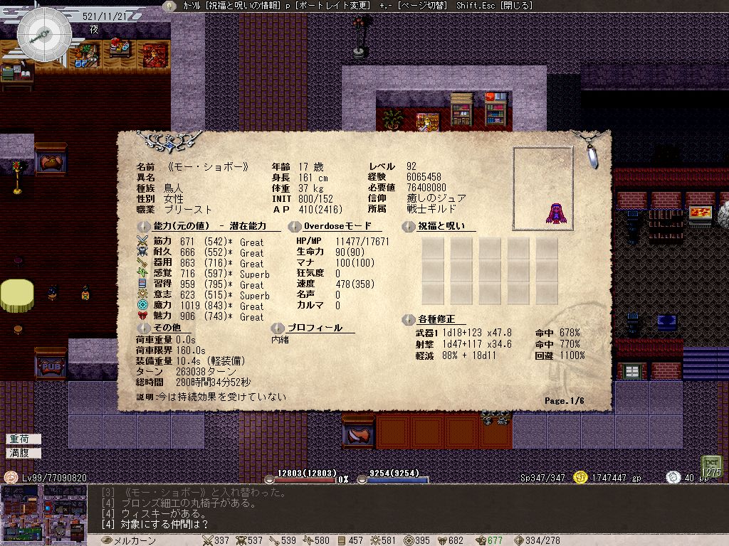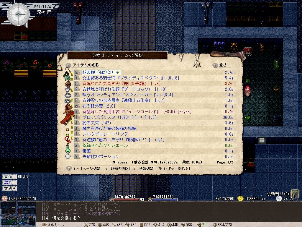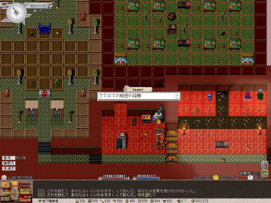 これはPCとペット両方に言えることなんだけど、何も考えずに食べ物を未鑑定のまま食べまくっていたので体重がヤバイことになっています。基本的に呪われた食べ物って体重が下がる以外にデメリットがないので(稀に拒食症に陥る弊害があるとはいえ)、構わず食ってたらこんなことになってしまった。