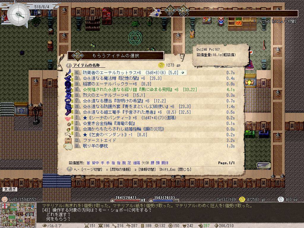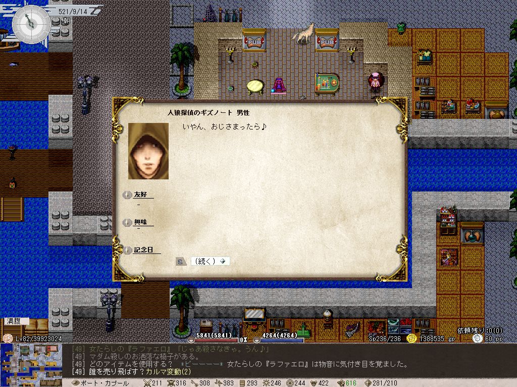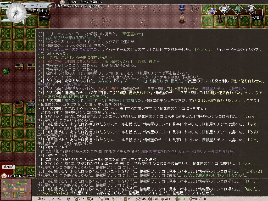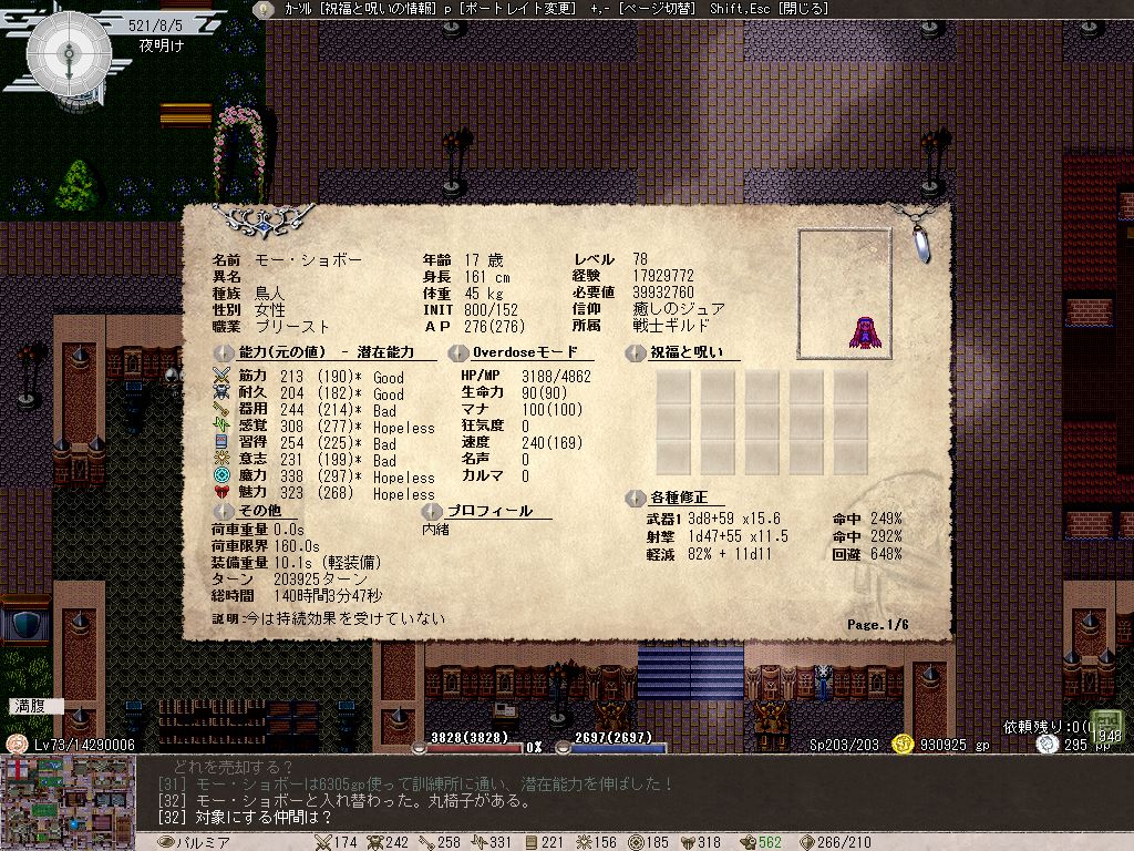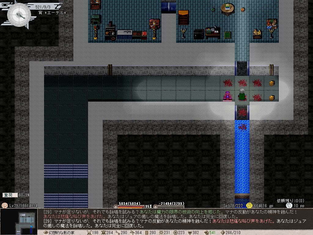 とりあえず魔力限界と回復魔法(ジュアの癒し)を鍛えるため、極限までMPを減らしてから釣りや読書などでスタミナを消費し、HPもMPもSPもゼロに近い状態になったら休息を取る…というどマゾいことをしていました。HP5000くらいだと、MPが-15000超えたあたりで一度でも失敗すると即消し飛ぶというスリリングな状況に。